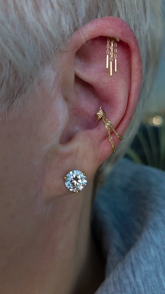 This client had some uneven lobe piercings, so we added a little stack to bring everything into balance, then finished it off with a daith.. eventually working toward a super shiny gemstone clicker 🔮 Everything was anodized gold to match her aesthetic, and honestly… I’m obsessed with how this one came out 🖤